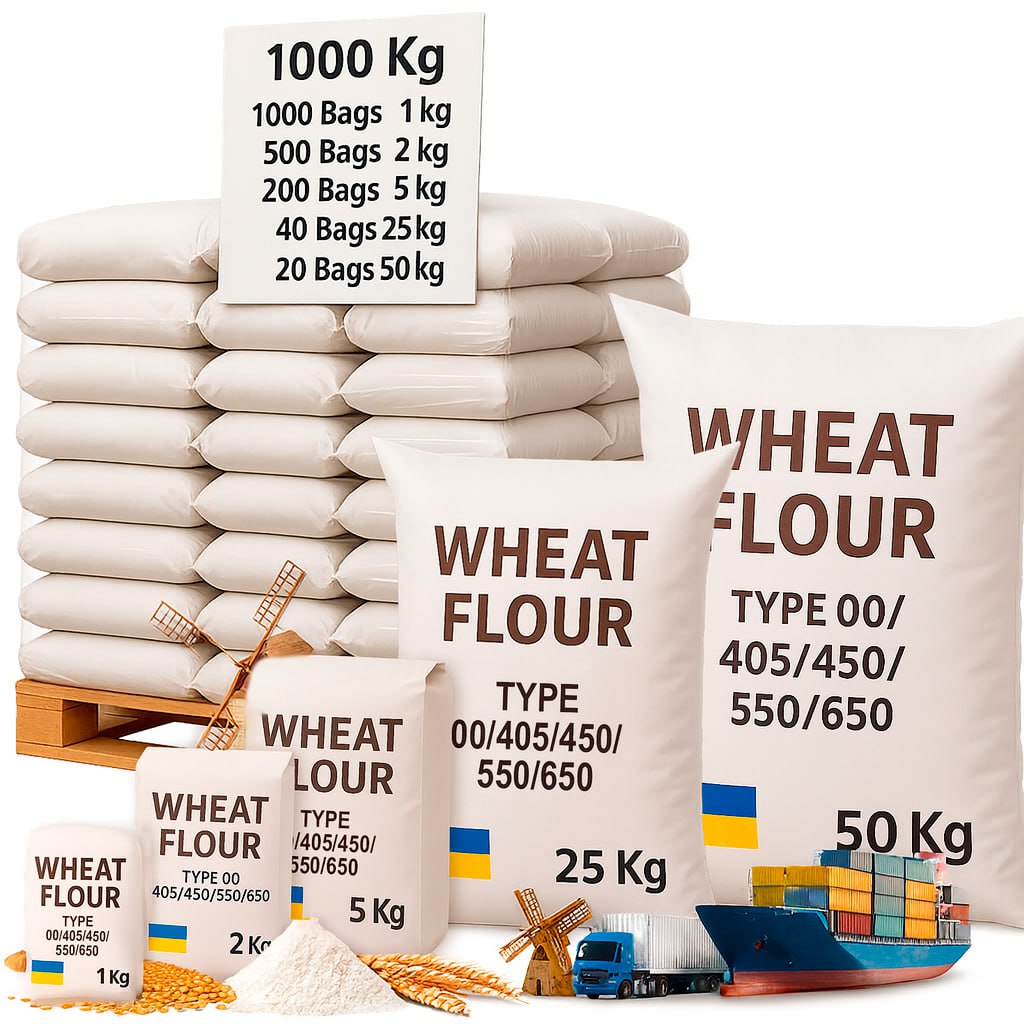 WHEAT FLOUR TYPE 00, 405, 450, 550, 650 (TOP GRADE) — PACKAGING: 1, 2, 5, 25 kg, and 50 kg. — MINIMUM ORDER: 1 TIR or sea container (24 tons). — DELIVERY TERMS: CIF (Incoterms 2020) to any seaport worldwide. — PRICING: Final price and delivery terms to be confirmed after individual inquiry.